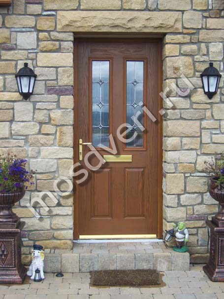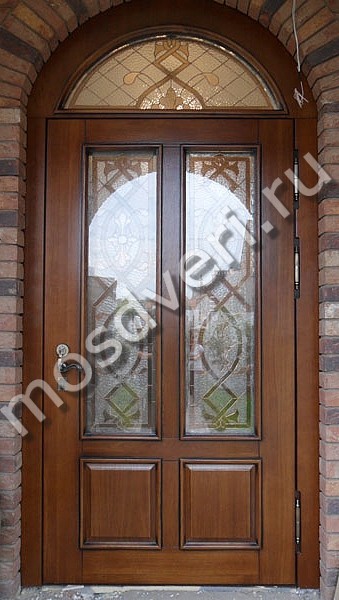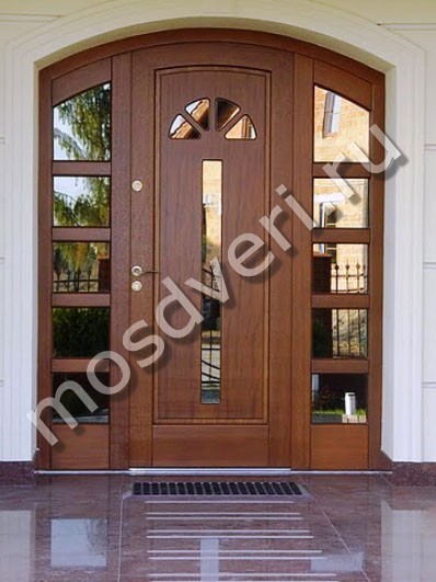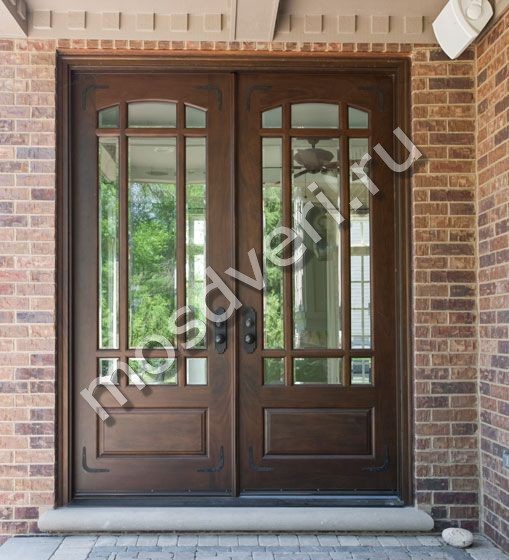Входная остеклённая дверь для загородного дома с отделкой массивом с двух сторон